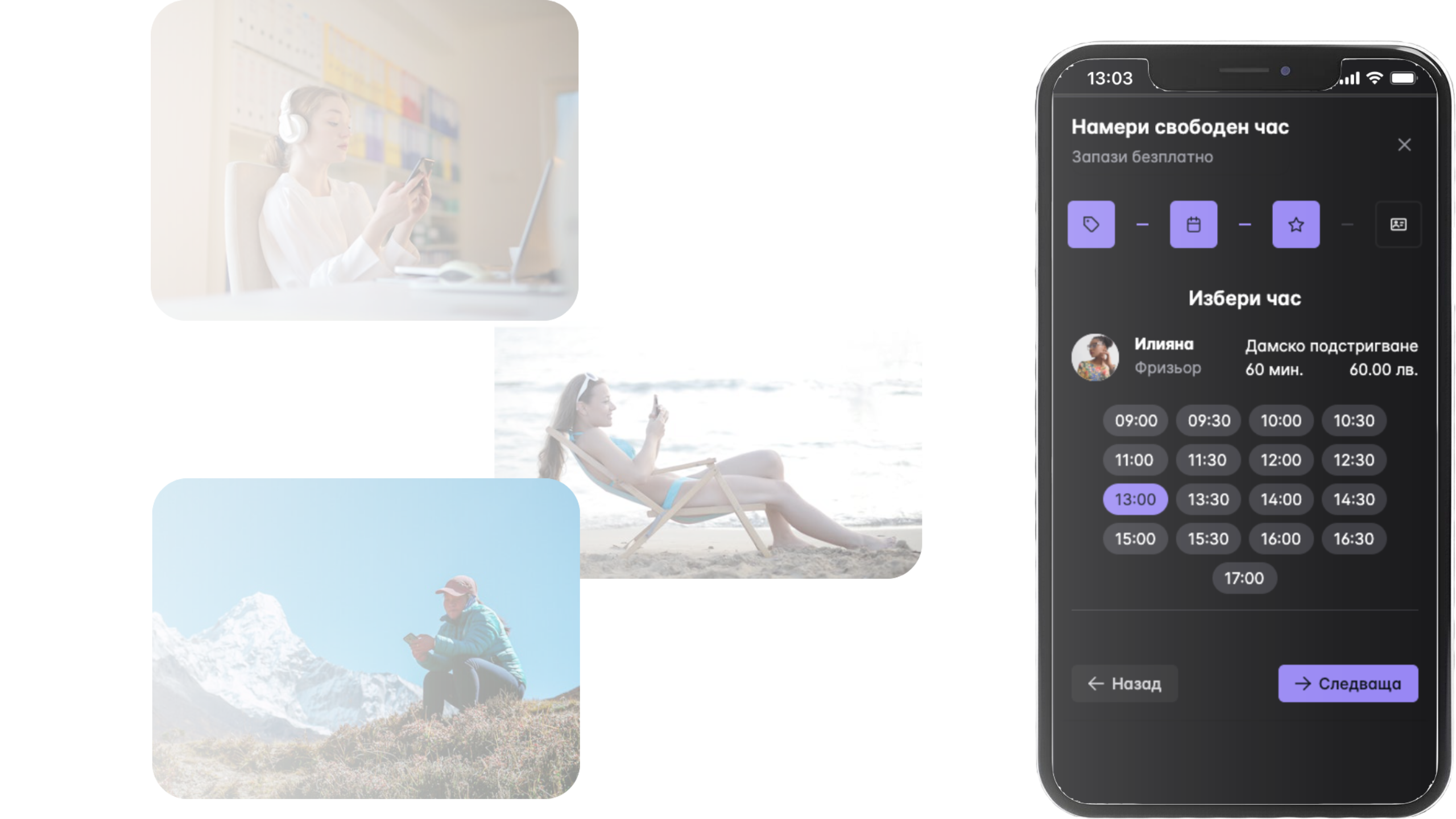 Нашият софтуер за планиране на график ви позволява да персонализирате процеса на записване на часове, за да отговаря на вашите нужди. Задайте време за предварителна записвания, предложете свободни часове за записвания в удобни интервали от 15, 20 или 30 минути. Можете също така да изисквате предварително онлайн плащане за да защитите часа си срещу неявяване.